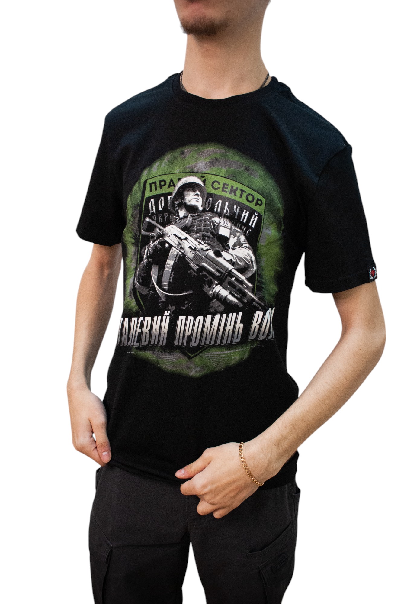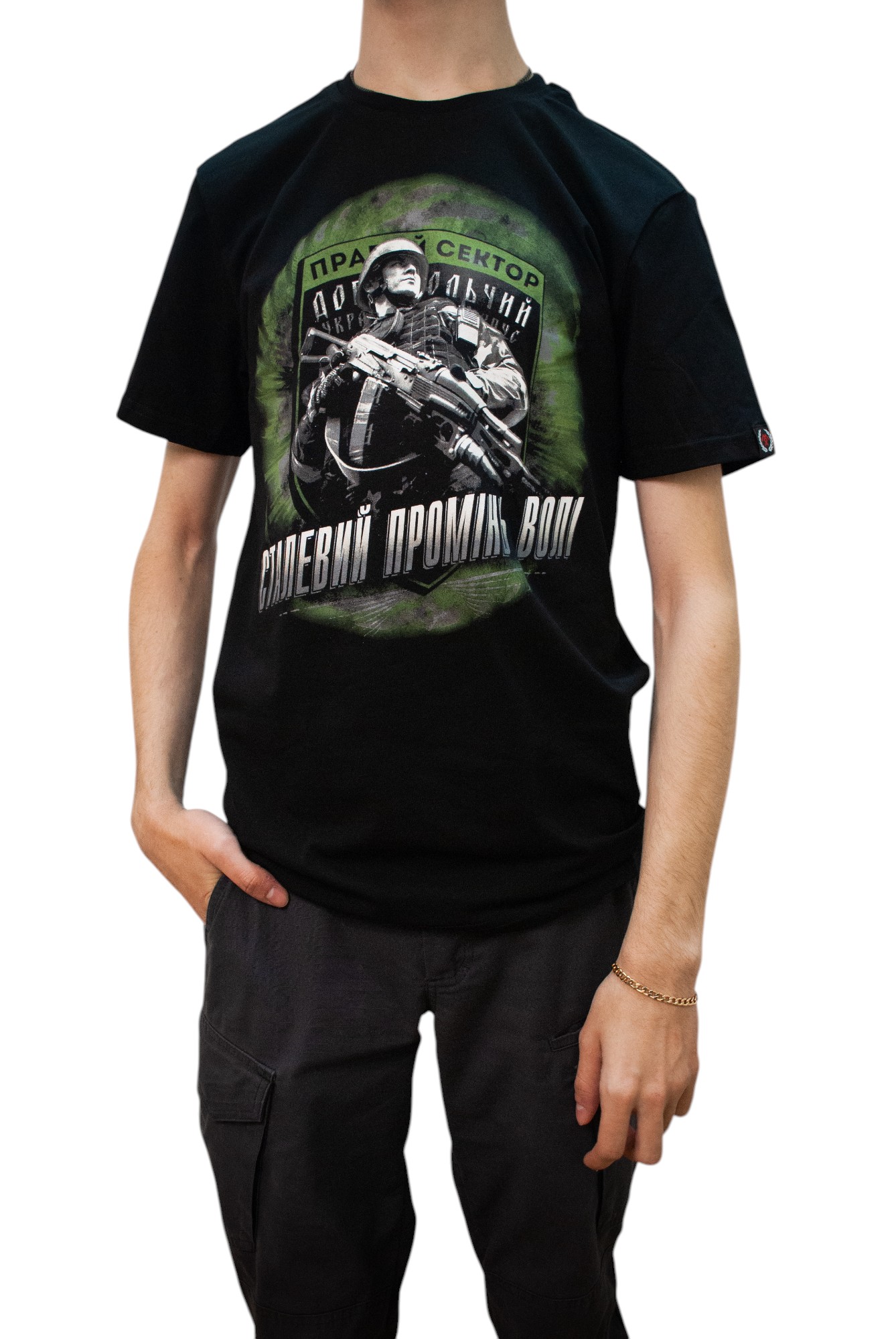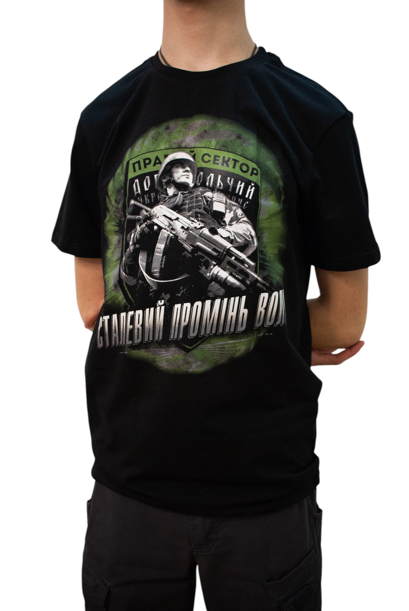 Футболка чорна "Сталевий Промінь Волі" з принтом зеленого кольору