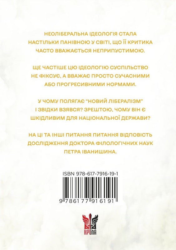 У новій монографії професора Петра Іванишина запропоновано герменевтичне трактування такого складного політико-ідеологічного явища,як неолібералізм. Спираючись на націософську традицію тлумачення ,на праці українських та закордонних авторів ,дослідник ретельно простежує визначення, витоки та основні течії повоєнного лібералізму,аналізує його зовнішню ,внутрішню, економічну та культурну політики,окреслює основні ідеологічні концепти, характер та структуру правлячого новоліберального класу. Автор підводить читача до висновку про імперський характер неолібералістичного політичного світогляду,що домінує на повоєнному Заході, й остерігається перед його бездумними імітаціями в новітній Україні. Видання розраховане на всіх тих, хто вивчає історію та теорію політичних ідеологій, філософію ідей,політологію,нацвологію,економіку та сучасну культуру.
